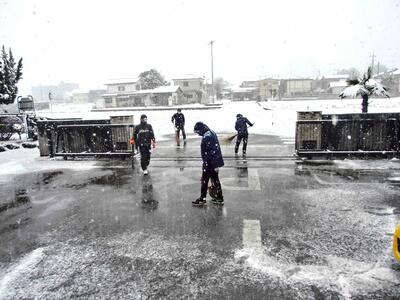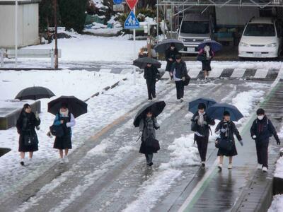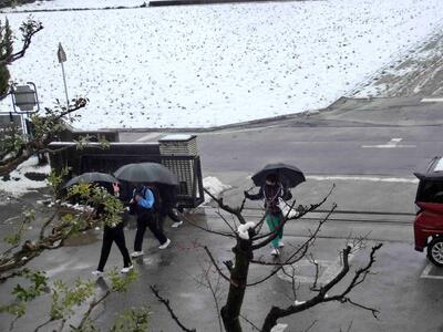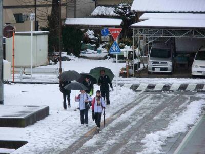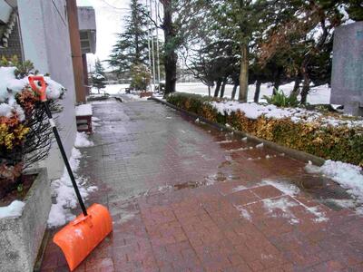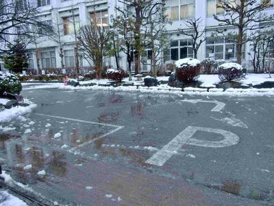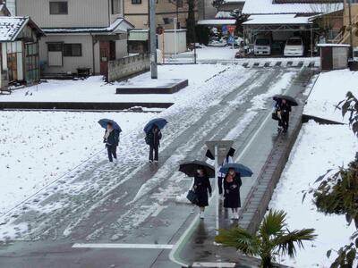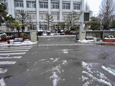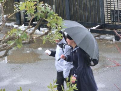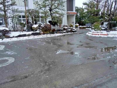 昨夜の雪の降り方だと、どうなることかと思いましたが、雨へと変わりアイスバーンはありませんでした。学校も塩カルをまいたおかげで、2時間ほどの作業で何とかなりました。ただ、かなりビシャビシャしているので、長靴の方が良いと思います。本日は、1時間遅れの登校となります。安全には十分注意をしてください。