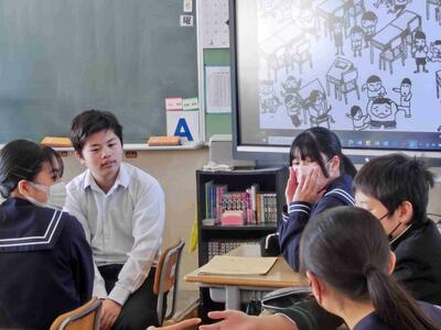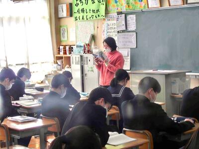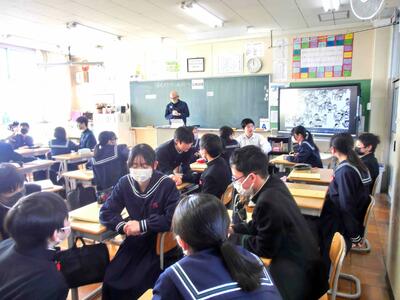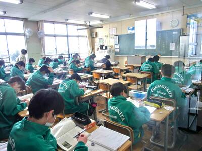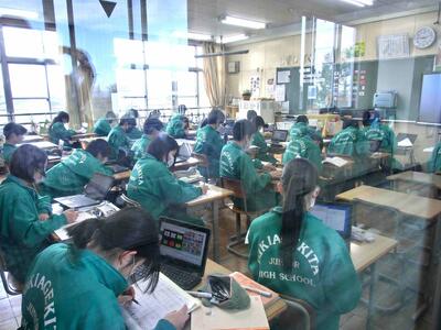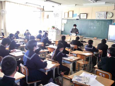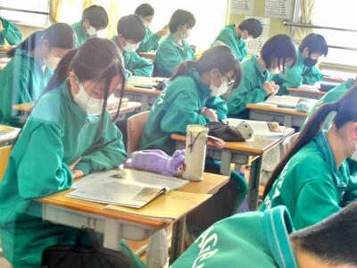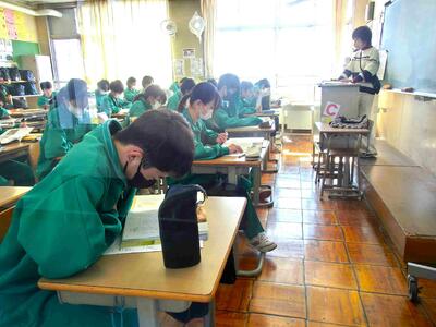 2月8日(木)、3年総合的な学習の時間(教科横断的学習)では、学級閉鎖や欠席により少ない人数での淋しい活動になりました。ワイワイにぎやかな教科も、今日は静かに。ただ、残り少ない時間数、発表や作品の完成が迫っている教科もあり、黙々と取り組んでいました。