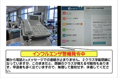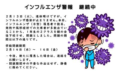 2月13日(火)、先週2クラスを閉鎖にしてインフルエンザ感染の終息をねらいましたが、朝から1年生のインフルエンザ罹患の連絡が多く、登校後、1年生の2クラスを下校させ、16日(金)までの閉鎖を決定しました。
