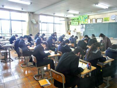 2月8日(木)、朝から欠席連絡が多くありましたが各教室とも空席が目立ちます。少し淋しいような・・・。3年生は、早々と学年末テストが延期となりました。1,2年生も2週間後です。早くインフルエンザ感染が終息してくれることを願います。