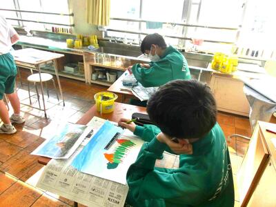 グラウンドが何とか使えるようになり、3年生がサッカーの授業を行いました。ボールを必死に追いかける姿がたくさん見られました。1年生美術の授業では、黙々と作品の制作に打ち込んでいました。写真と同じ色を出すのは難しいですね。
