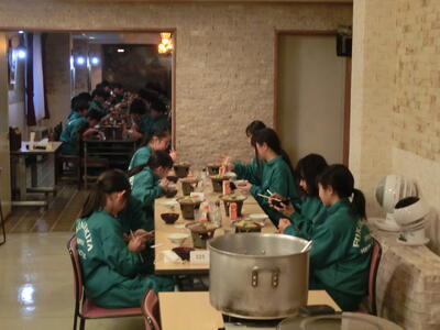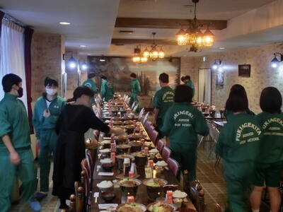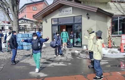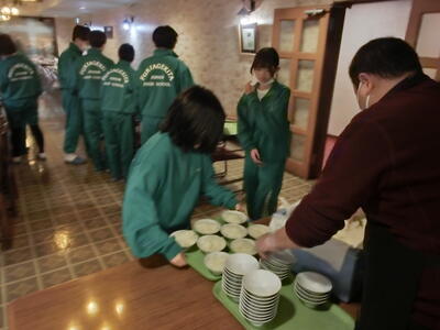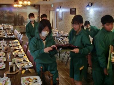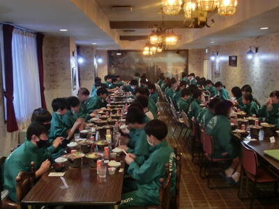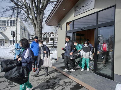 スキー講習閉校式が終わり、最後の美味しい昼食。ホテルの方、写真屋さんに感謝を伝え、インストラクターさんの見送りを受けバスにてホテルを出発しました。充実した3日間でしたね。