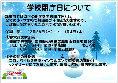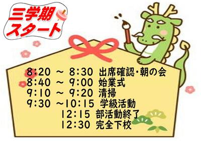 明日1月9日(火)、いよいよ3学期が始まります。充実した冬休みを終え、皆元気に登校できることを願っています。日程は以下の通りです。ご確認ください。