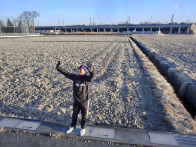 12月27日(水)、地上絵が出現。最後の練習の後に、塩化カルシウム(塩カル)融雪剤をまきました。塩カルは水と反応して多量の溶解熱を発生するほか、水の凍結温度を大幅 に下げるため、即効性のある強い凍結防止作用と融氷雪作用を 発揮するものです。全面真っ白になるはずが、予算の関係で少量でのやりくりです。