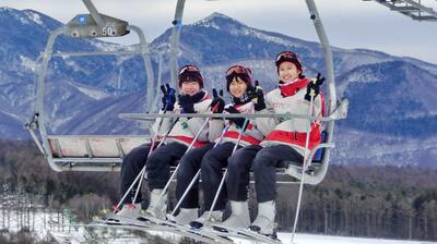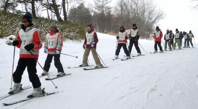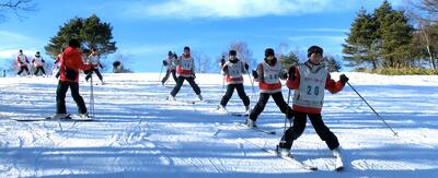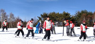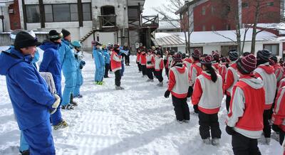 昼食を終えウエアに着替えて開校式。その後班ごとに分かれてインストラクターさんに丁寧に教えていただきました。上級班は早くもリフトに乗り上から滑りました。初級班は基礎をみっちりと。ここが我慢のしどころ!明日には滑れるようになります!