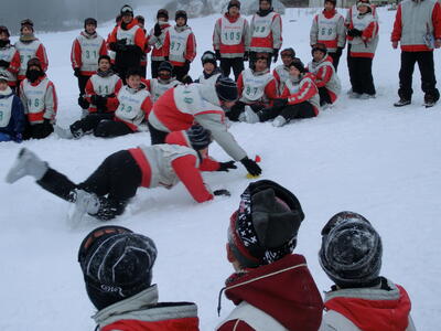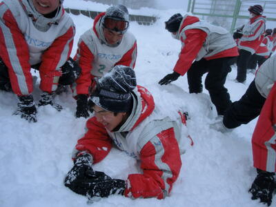 スキー講習修了後、皆で雪上レクを楽しみました。「スノーフラッグス」「どこの班が雪を高く積めるか」など、疲れ知らずで動き回りました。天候が悪く、とても寒かったです。