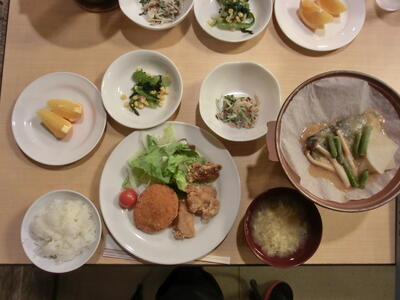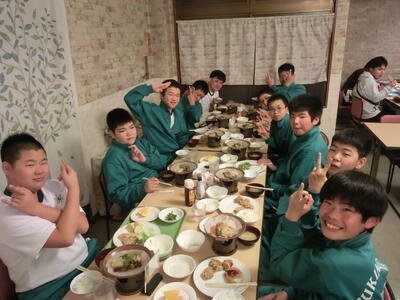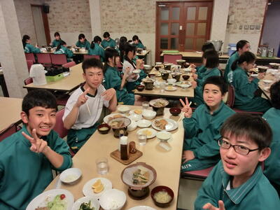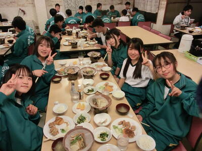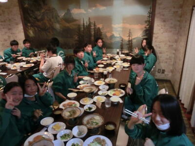 入浴後、みんなで夕食です。係が手際よく準備を手伝い時間どおりにいただきます。多くの仲間で食べるのは格別ですね。美味しくいただきました。食事の後は自由時間。そして就寝となり1日目の終了です。