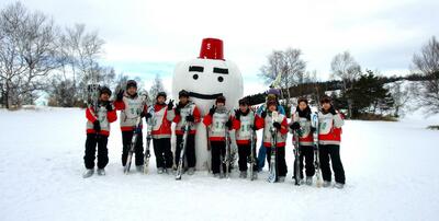 晴れました!暖かくて雪が溶けてます。昼食後、班ごとにインストラクターさんと記念撮影。良い天気の中、気持ちよく滑ることができました。さぞかし上達したことでしょう!?