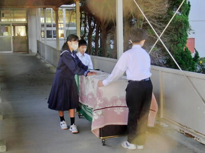 11月14日(火)、今日は県民の日で学校閉庁日です。が、吹奏楽部のアンサンブルコンテストや剣道の新人戦県大会が行われています。吹奏楽部は、楽器をトラックに積み終わりこれからクレアこうのすに出発です!頑張って!! 結果については、剣道と併せて後日UPします。