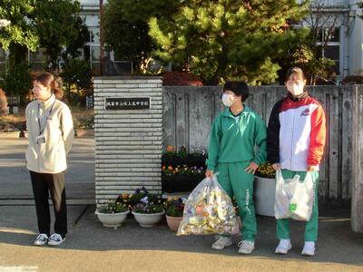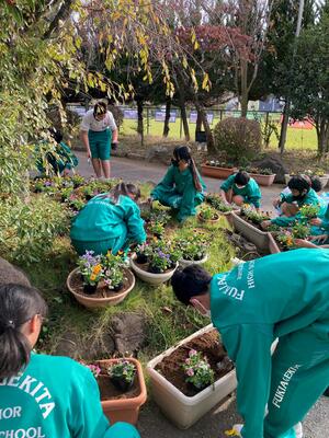 11月15日(水)、校内ボランティアと並行して「花いっぱい運動」を行いました。パンジーやビオラを地植えや鉢、プランターに植えました。数が多く大変な作業となりましたが、きれいに整いました。