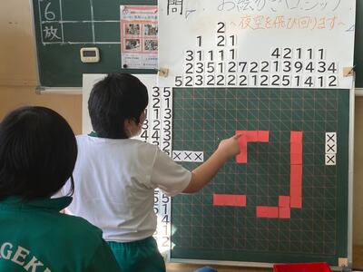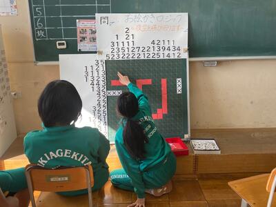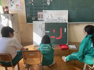 11月21日(火)、さくら学級の教室を覗くと、方眼黒板に向かい、頭をひねりながら考え込んでいる生徒達の姿がありました。「お絵かきロジック」奮闘中でした。「お絵かきロジック」とは、縦と横の数字をヒントに塗り潰すマス目を割り出し、そのとおりに塗り潰していくと、最終的に絵(または文字)が浮かび上がるタイプのペンシルパズルのこと。将棋盤に向かう藤井聡太さんの姿を見ているようでした。完成した絵が楽しみです。