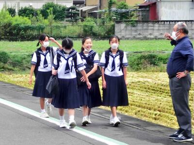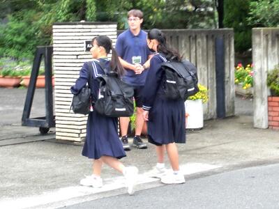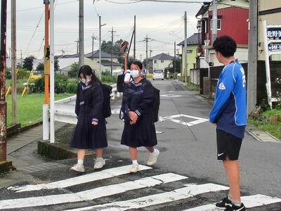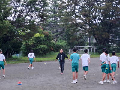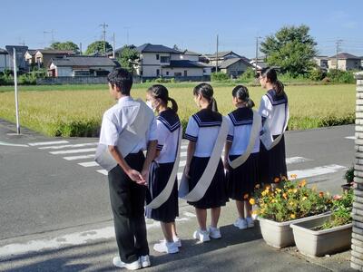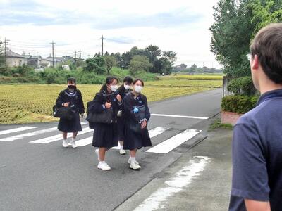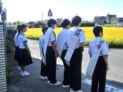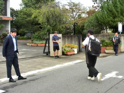 10月5日(木)、朝から教員総出で登校指導です。それぞれの担当場所に移動して、地域や交通の状況、生徒の登校の様子をあいさつも含めて行いました。また、グラウンドでは駅伝チームが朝練習で汗を流していました。