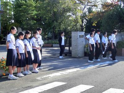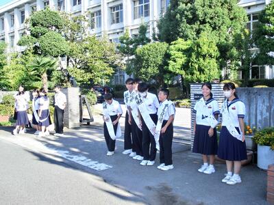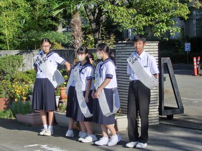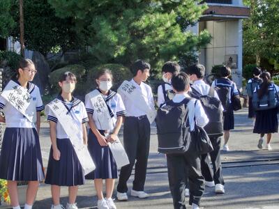 10月2日(月)より、第42期生徒会本部役員選挙運動が始まりました。会長、副会長、書記、会計の各立候補者は、朝の登校時間に正門にて大きな声であいさつをしながらアピールしています。