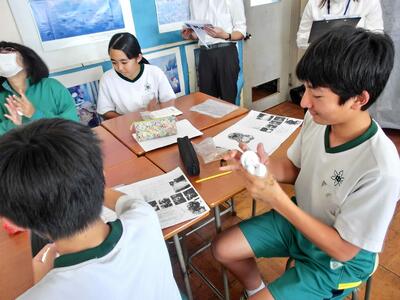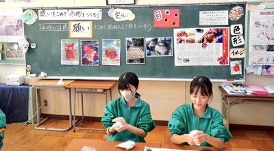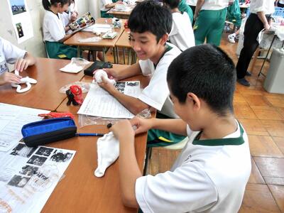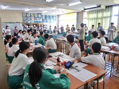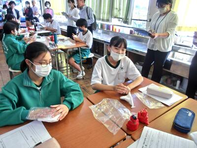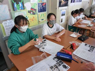 11月12日(木)、鴻巣市の図工・美術研究部授業研究会が本校を会場に行われました。題材は無形民俗文化財である鴻巣市の伝統工芸「赤物」制作です。多くの先生方が参観する中ですが、1年3組の生徒達は緊張することもなくいつも通りのペースで作業を進めていました。