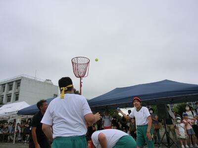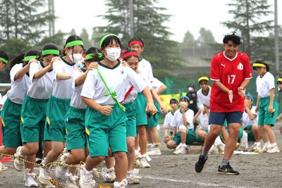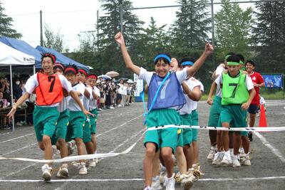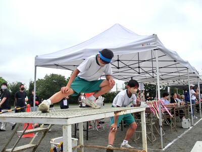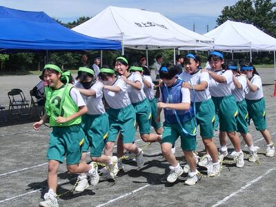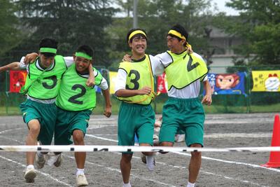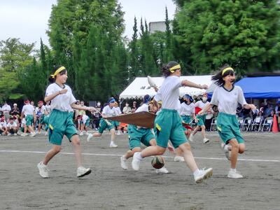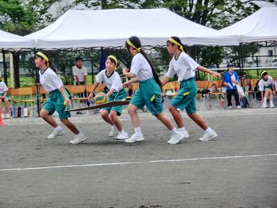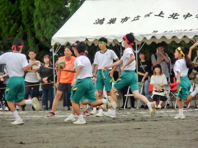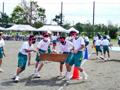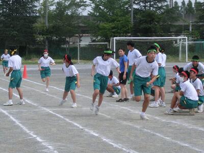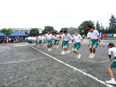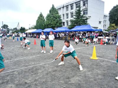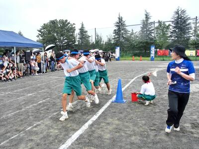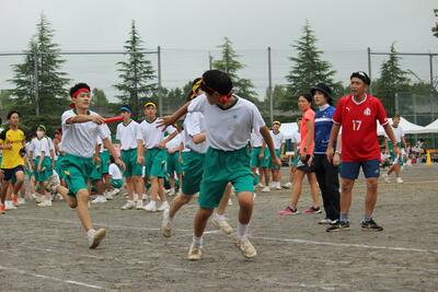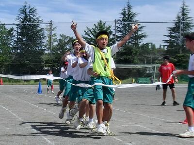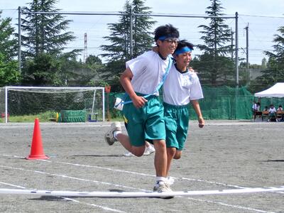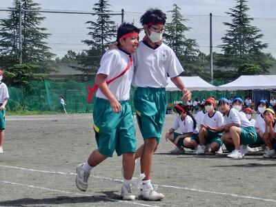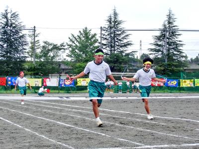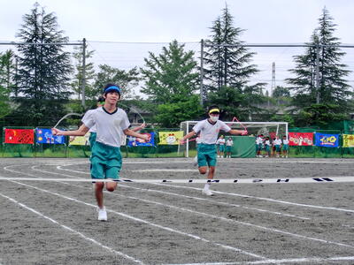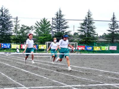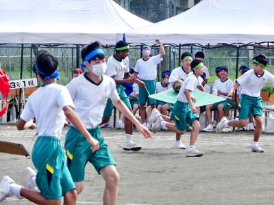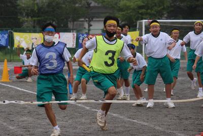 唯一行われた学年レク種目。3年生最後の体育祭は クラスが一致団結し、担任も一緒に声を出し、息を 合わせて走り抜きました。本当に見応えのあるレー スでした!! |