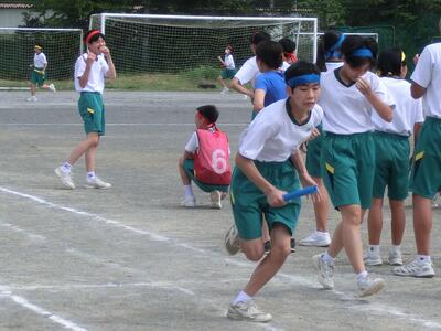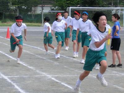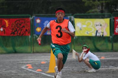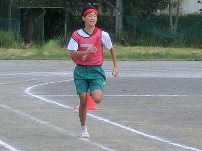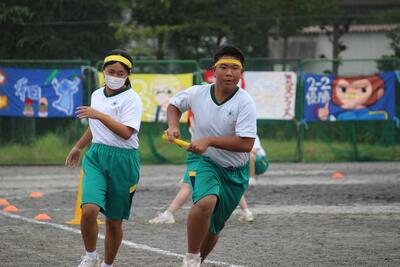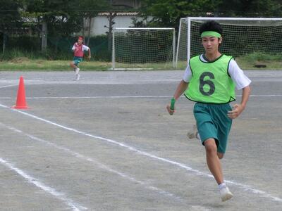 9月6日(水)、3年生全員リレーの様子です。今日は日差しも少なく走りやすい天候です。