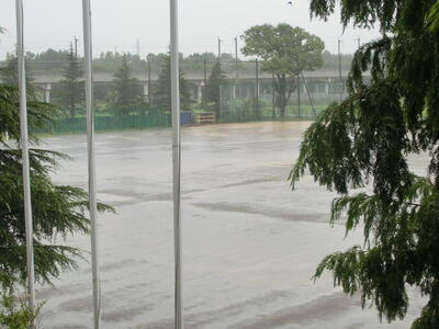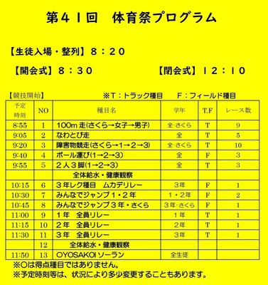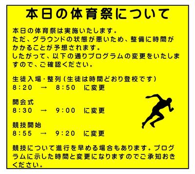 台風の影響により、明日の体育祭が心配されますが、現在の所、予定通り実施の方向で準備をしています。本日ご家庭に向けてプログラムと、留意点についてのご案内を配布しましたので、ご確認ください。当日については、判定をした時点でeメッセージにてメールを配信いたします。