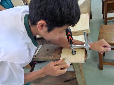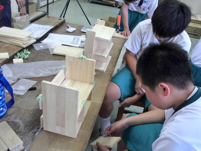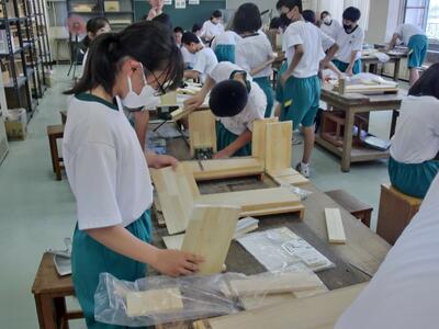 7月12日(水)、技術の授業での様子。制作中の木工、汗をかきながらヤスリで擦り、角を落とす作業を繰り返し行っていました。完成に近づいてきました!