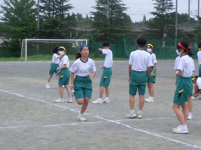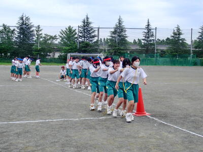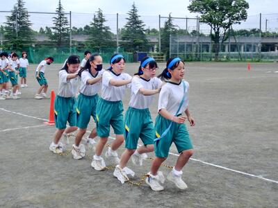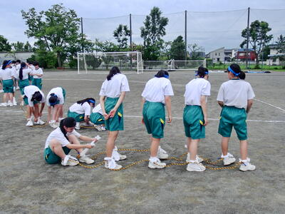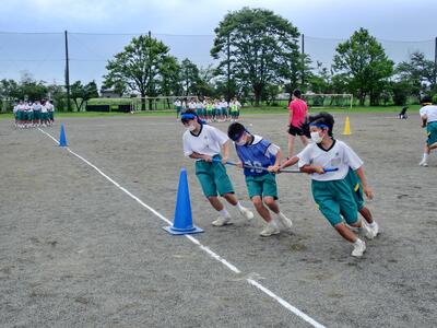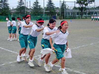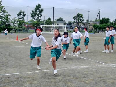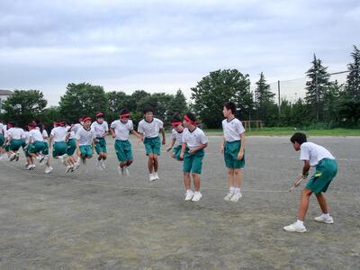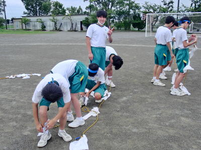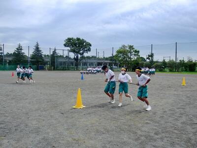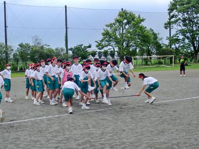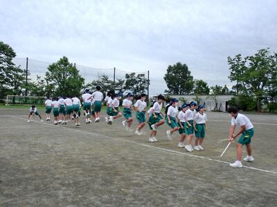 7月13日(木)、今までの蒸し暑さから一転、涼しく感じるのは気のせいでしょうか?3年生の体育の授業、体育祭の種目練習を行いました。大縄跳び「みんなでジャンプ」、ムカデリレーと熱の入った練習をしていました。