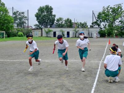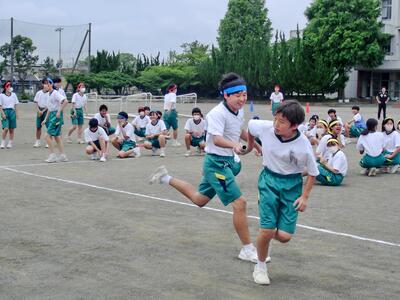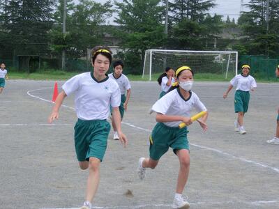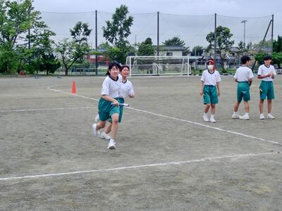 7月14日(金)、2年生体育の授業で、体育祭のクラス全員リレーの練習を行いました。抜いたり抜かれたり、3クラスとも最後まで良い勝負でした!