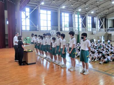 7月14日(金)、1学期の表彰集会を行いました。学校総合体育大会北足立北部班大会をはじめ、埼玉県硬筆中央展覧会、鴻巣市硬筆展覧会等の受賞者の表彰です。おめでとうございます。
