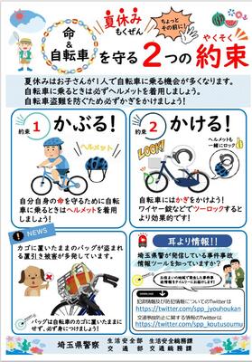 夏休みを前に、埼玉県警察より注意喚起の通知が届いています。夏の交通事故防止運動は7月15日(土)~7月24日(月)までとなっています。自転車に乗るときは、自分自身の命を守るためにヘルメットを着用する。また、自転車が盗まれないように鍵をかける。日頃から意識を高く持ちましょう。