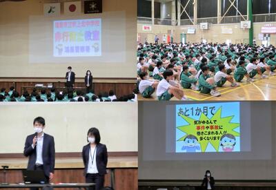 6月14日(水)、非行防止教室を行いました。鴻巣警察生活安全課より、2名の署員様にご来校いただき、SNSに関することや薬物・闇バイトについてのお話をいただきました。SNSの悪質な書き込みにより相手を傷つけるという、見ていて嫌な気持ちになる再現ドラマを見たりと、具体的な内容でした。夏休前の注意喚起です!