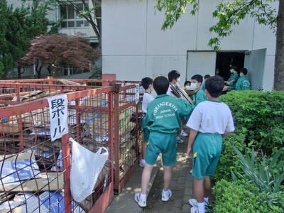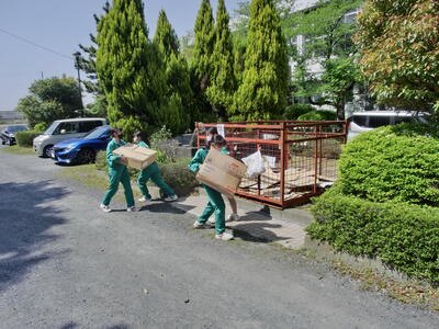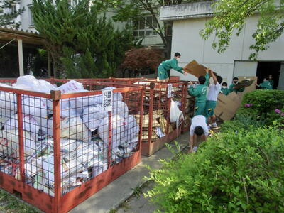 4月20日(木)、半年近く校内で出た資源や地域から頂いた段ボールをストックしていて、部屋がいっぱいになるほど集まったため、回収業者にコンテナを運んでもらい、積み込み作業を開始しました。