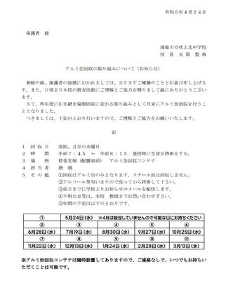 4月24日(月)、本日、保護者の皆様にアルミ缶回収のお知らせをお配りしました。回収日を設定していますが、いつでも可能です。生徒が登校するときに持参させてください。回収日前には、メールでお知らせをいたします。また、ホームページをご覧の地域の方でも、お持ちいただけましたら大歓迎です。ご協力お願いいたします。