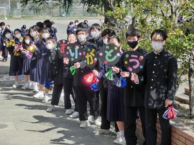 3月15日(水)、第40回卒業証書授与式の続報です。卒業生代表の言葉では、3年間の思い出が走馬灯のようによみがえりました。卒業生合唱では、心を込めて「旅立ちの日に」を精一杯歌いました。退場時にはPTAより関係職員が花束の心配りをいただきました。リモートで参加していた1,2年生も見送りでは直接お別れをしました。
