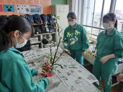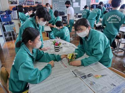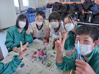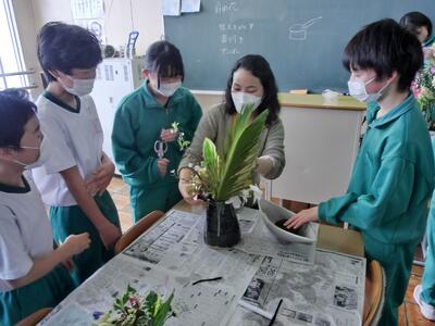 3月23日(木)、1年生最後の社会科の授業で、華道が始まったと言われる室町時代の文化を体験しました。卒業式の壇上花を利用して、思い思いの作品を仕上げました。完成した作品は、来客を迎える場所に飾りましょう。