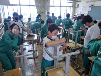 3月14日(火)、明日に迫った卒業証書授与式の準備を1,2年生で行いました。1年生は昇降口、3年生教室や廊下、外掃除を一生懸命に。2年生は重要な会場準備を担いました。手分けをして手際よく作業を行い、見事な会場を作り上げました。あとは主役を待つばかり。