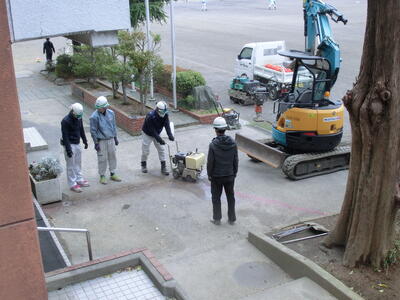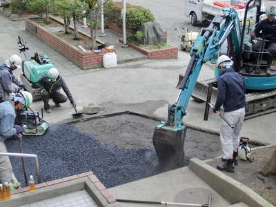 3月28日(火)、昇降口前が、木の根っこが張ってしまったことから、大きくくぼみ水たまりができるようになっていました。掘り返して整地をしてアスファルトで固めていただきました。真っ直ぐで平らになりました。