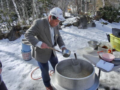 午後のスキー講習では、別の山にリフトで移動しチャレンジをしました。講習後の雪遊びでは、各々自由に遊びました。そしてプリンスホテル特有の菅平汁。社長自ら味付けし振る舞われました。とても美味しかったです。