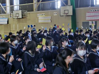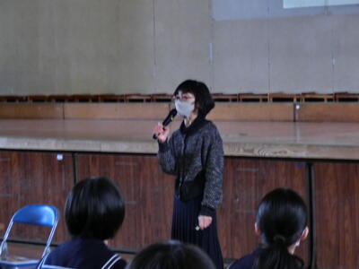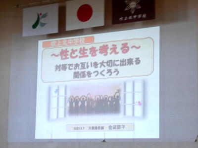 3年生、卒業期恒例の「性教育講演会」を実施しました。講師に金田節子先生をお招きし、~性と生を考える~対等でお互いを大切に出来る関係をつくろうの演題についてお話をいただきました。性を学ぶことは、どう生きていくか、どう人と良い関係を作っていくかを考えること。正しい知識や情報を踏まえて、自分にとって少しでも良いと思える選択ができるようになって欲しいという願いが込められたお話でした。