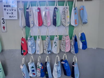 1年生、家庭科の授業での作品が展示されました。色とりどりの、おもいおもいのデザインで、ミシンや手縫いで仕上げた世界に一つの作品です。家に持ち帰って、使うのでしょうね。
