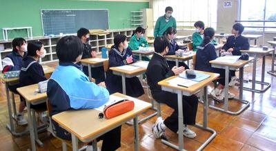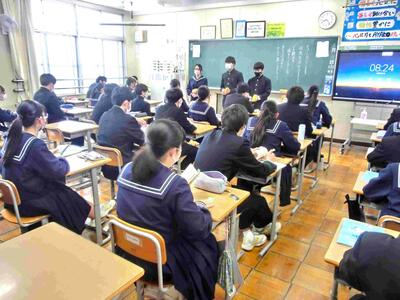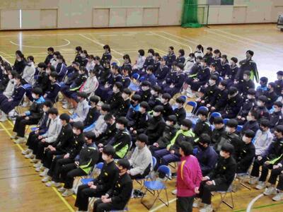 3.11に合わせて、避難訓練・防災教育講演会を行いました。元自衛官で防災士の柳様をお招きして防災についての色々なお話を聞きました。避難訓練は真剣に行うこと、地域の中では中学生は大きな力となること等、意識が高まりました。もし被災したときの「自宅避難生活お役立ちグッズ10選」を教えていただき、皆で暗記しました。