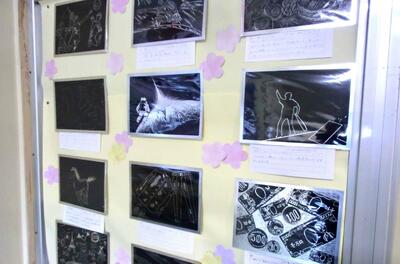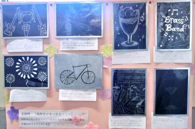 3年生の、中学校生活最後の作品が展示されています。「高校生になったら」というテーマで制作しました。それぞれやりたいこと等が作品で表現されています。