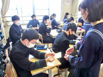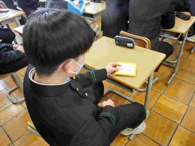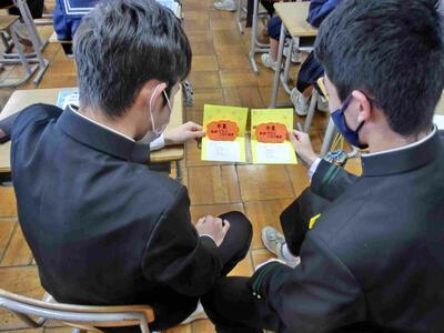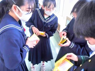 今日は「三送会」が行われます。そこで、下級生より「招待状」を3年生に渡しました。朝の短い時間でしたが、全員に届けることができました。もらった3年生も照れくさそうでしたが、嬉しいでしょうね。