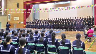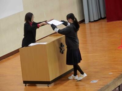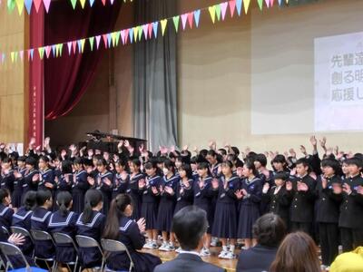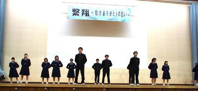 3年生の企画です。「呼びかけ」「合唱 正解」、後輩達に、また先生方に向けてメッセージを伝えました。そして歌が得意な3年生、見事な合唱を披露しました。歌で伝えるって、ステキですよね。1,2年生も、その気持ちしっかりと受け取りました。