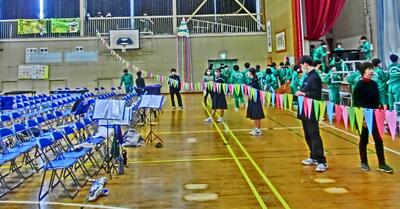 式練習の後、「球技会」で汗を流しました。体育館と校庭に分かれて、バスケットボール・サッカーそしてドッジボールです。昨日の悪天候で校庭の状態が心配でしたが、何とか使えて良かったですね。思い切り動き、クラスの勝利のために皆頑張っていました。明日は「三年生を送る会」ですね。