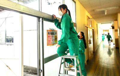 3年生が、朝から奉仕作業のために廊下の窓拭きやトイレ、昇降口、天体観測室の清掃を行いました。普段の掃除の時間ではできない隅の方を中心にきれいにしてくれました。助かりました、ありがとう!