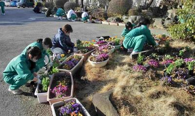 強風の中、PTAの皆さんにもご協力いただき「PTA合同花いっぱい運動」を行いました。例年になく花たちの勢いがあるため、プランターを数多く追加して、文字通り花あふれる吹上北中学校となりました。奉仕委員会のみなさん、PTAの皆さんのおかげで、花に囲まれ気持ち良く3月を迎えられます。ありがとうございました。