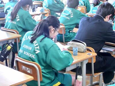 3月に入り、3年生は特別日課となりました。同時に、いよいよ卒業式に向けての練習が本格化します。今日は学年の先生方より、卒業式に臨むに当たっての心構えや、所作、入場の並び順の確認等を行いました。あと2週間、あっという間に過ぎて行ってしまいますよ。