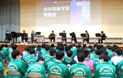 3年生が、総合的な学習の時間での教科発展学習の発表会を行いました。それぞれの講座ごとに、取り組んだ成果を、工夫し、面白おかしく発表しました。2時間、たっぷりと楽しめましたね!まずは、前半の発表の様子です。